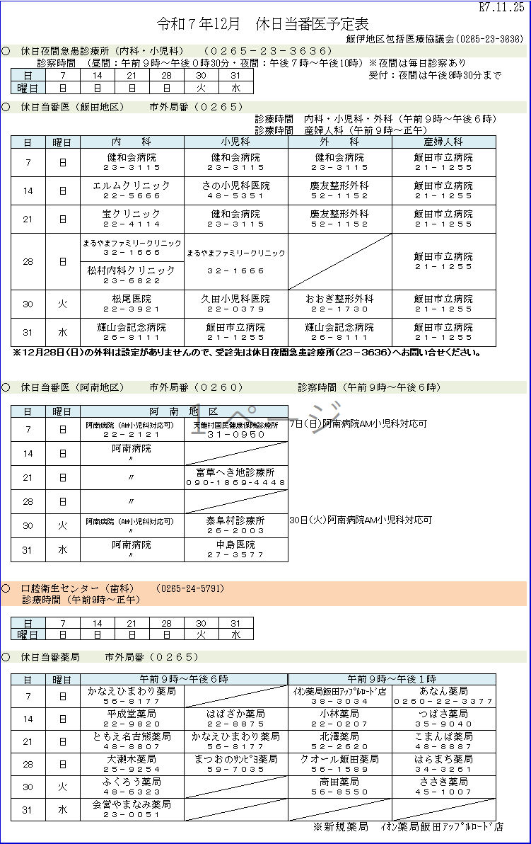 令和7年12月休日当番医の予定をお知らせいたします。 ※変更になることもありますので、お電話で事前にご確認をおねがいいたします。 令和7年12月休日当番医予定表R7.11.25 カテゴリ: 休日当番医2025年11月25日 この記事を共有する Share on XShare on X Share on FacebookShare on Facebook Share on LinkedInShare on LinkedIn Post navigation前の記事:Previous post:休日当番医予定表(令和7年10月版)次の記事:Next post:休日当番医予定表(令和7年11月変更版)関連情報休日当番医予定表(令和8年1月版)2025年12月19日休日当番医予定表(令和7年11月変更版)2025年11月27日休日当番医予定表(令和7年10月版)2025年9月24日休日当番医予定表(令和7年9月版)2025年8月29日休日当番医予定表(令和7年8月版)2025年8月1日休日当番医予定表(令和7年7月版)2025年7月4日