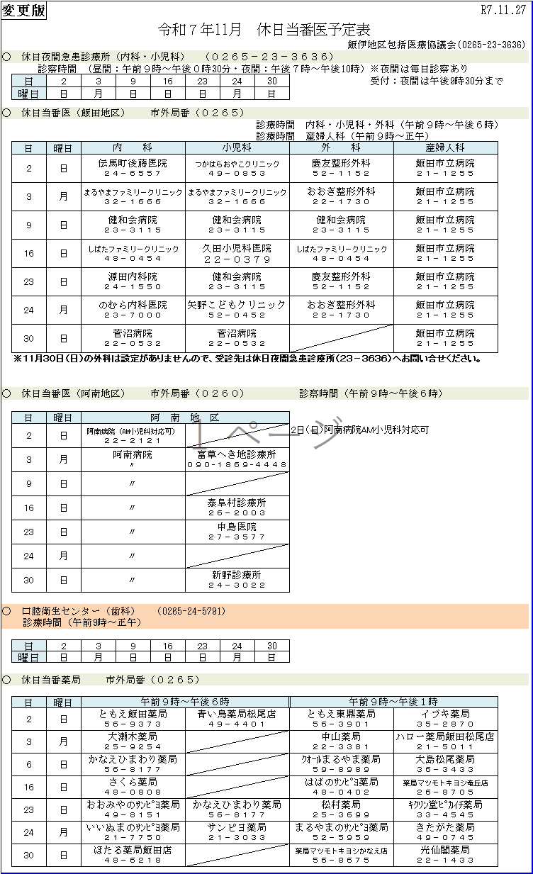 令和7年11月休日当番医の予定をお知らせいたします。 ※変更になることもありますので、お電話で事前にご確認をおねがいいたします。 令和7年11月休日当番医予定表R7.11.27 カテゴリ: 休日当番医2025年11月27日 この記事を共有する Share on XShare on X Share on FacebookShare on Facebook Share on LinkedInShare on LinkedIn Post navigation前の記事:Previous post:休日当番医予定表(令和7年12月版)次の記事:Next post:休日当番医予定表(令和8年1月版)関連情報休日当番医予定表(令和8年2月版)2026年1月26日休日当番医予定表(令和8年1月版)2025年12月19日休日当番医予定表(令和7年12月版)2025年11月25日休日当番医予定表(令和7年10月版)2025年9月24日休日当番医予定表(令和7年9月版)2025年8月29日休日当番医予定表(令和7年8月版)2025年8月1日