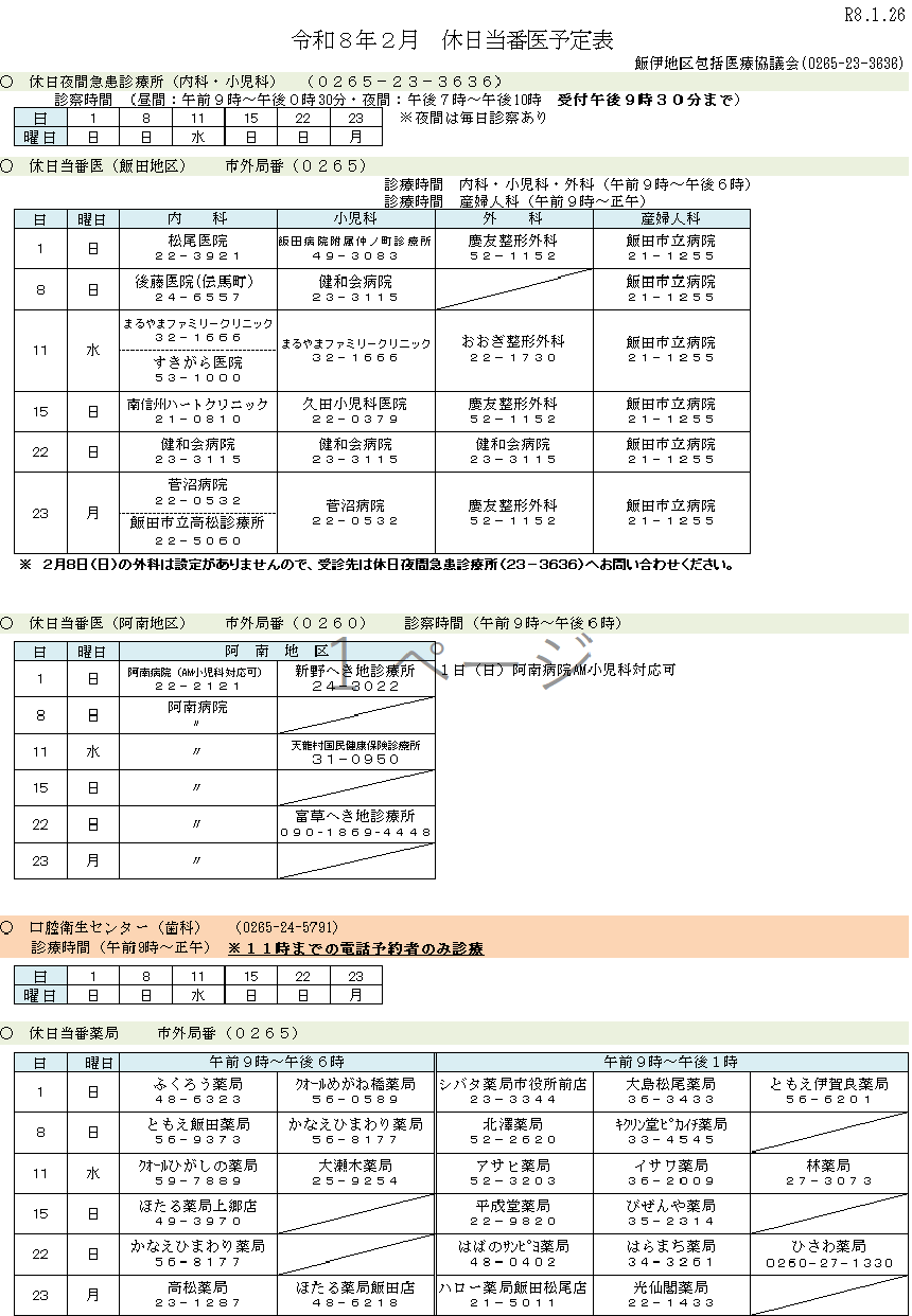 令和8年2月休日当番医の予定をお知らせいたします。 ※変更になることもありますので、お電話で事前にご確認をおねがいいたします。 令和8年2月休日当番医予定表R8.1.26 カテゴリ: 休日当番医2026年1月26日 この記事を共有する Share on XShare on X Share on FacebookShare on Facebook Share on LinkedInShare on LinkedIn Post navigation前の記事:Previous post:休日当番医予定表(令和8年1月版)関連情報休日当番医予定表(令和8年1月版)2025年12月19日休日当番医予定表(令和7年11月変更版)2025年11月27日休日当番医予定表(令和7年12月版)2025年11月25日休日当番医予定表(令和7年10月版)2025年9月24日休日当番医予定表(令和7年9月版)2025年8月29日休日当番医予定表(令和7年8月版)2025年8月1日